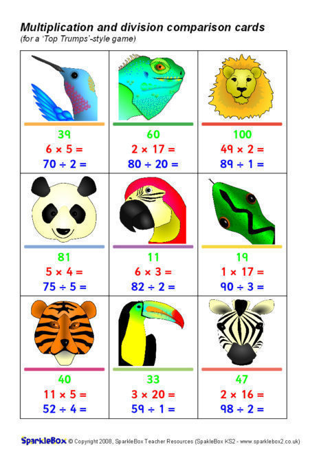 A great set of 45 cards (9 per A4 page) for use in a ‘Top Trumps’-style game.  Children each have a hand of cards and take turns to compare either the number, multiplication or division so that the child with the highest result keeps the cards in each round.  Includes multiplication and division with results up to 100.