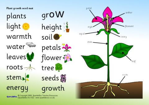 A simple word mat featuring words connected with plant growth, including a labelled diagram of a flowering plant.