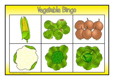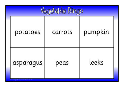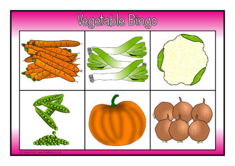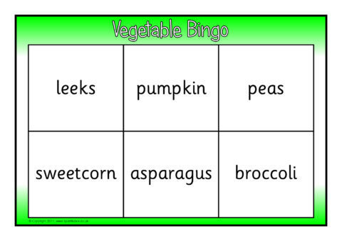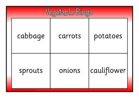 A set of bingo boards and picture cards featuring a selection of vegetables. Includes both word and picture boards.
