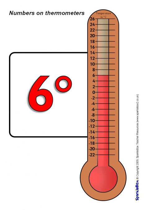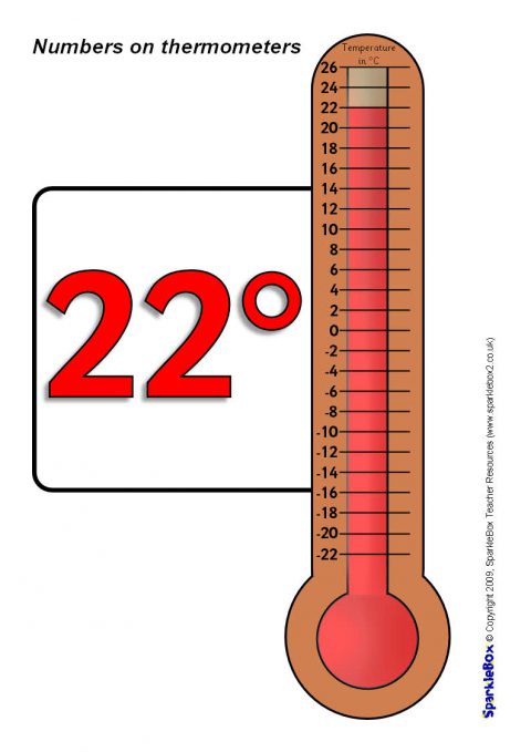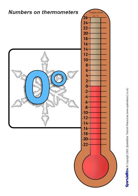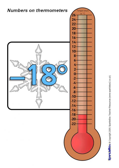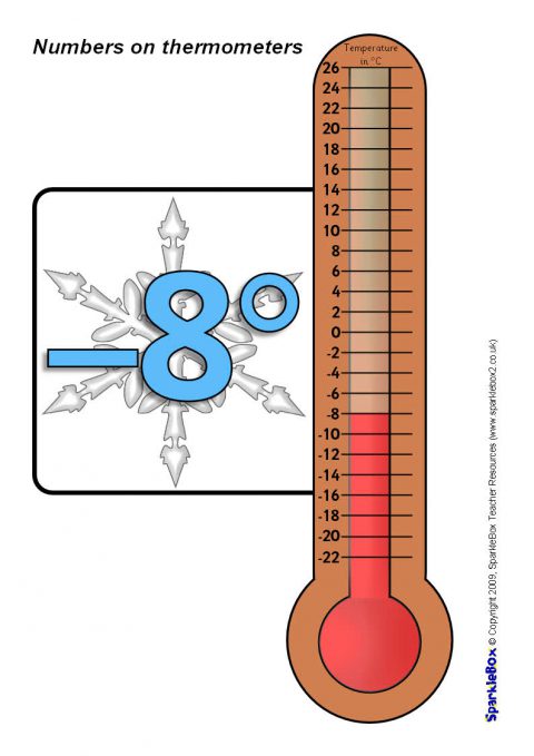 Numbers from -22 to +26 presented with thermometers. A great way of visually representing negative numbers, and a handy link to science.