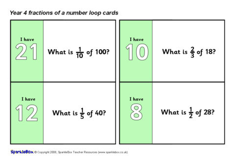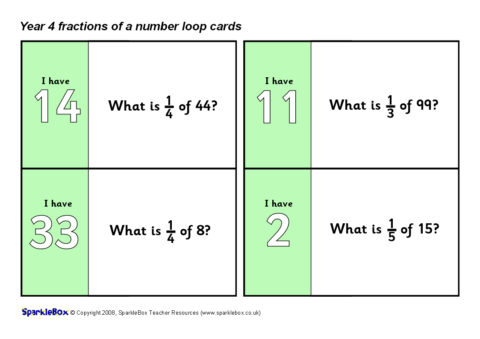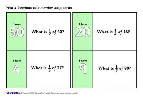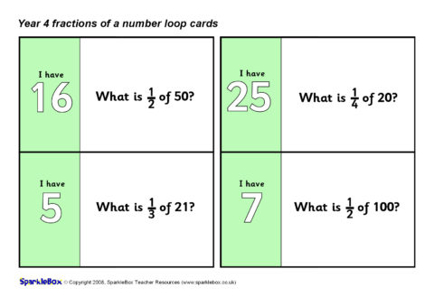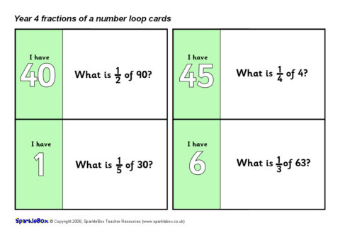 A set of loop cards with questions related to the fractions of a number - aimed at Year 4. Questions include ‘What is ½ of 90?’, ‘What is 2/3 of 90?’ and ‘What is 1/3 of 27?’. One child calls out the start card and the pupils then match/call out the corresponding cards until the game ‘loops’ back to the original child.