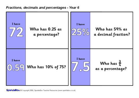 A set of loop cards with questions and answers related to converting fractions, decimals and percentages. Aimed at Year 6. 30 different cards included.