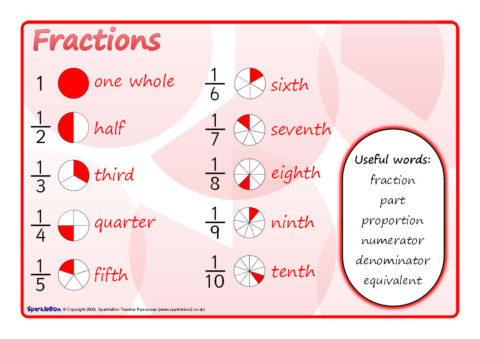 A printable desktop mat showing common fractions visually together with usual vocabulary.
