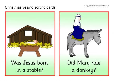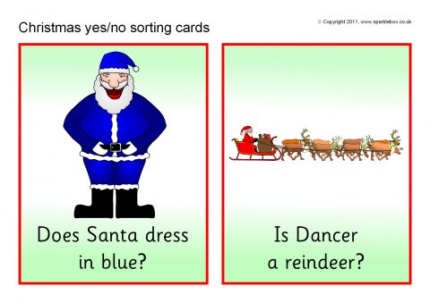 A set of printable cards posing questions about Christmas that can be answered ‘yes’ or ‘no’. Includes questions such as, ‘Does Santa dress in blue?’, ‘Does he ride a bicycle?’, ‘Was Jesus born in a stable?’