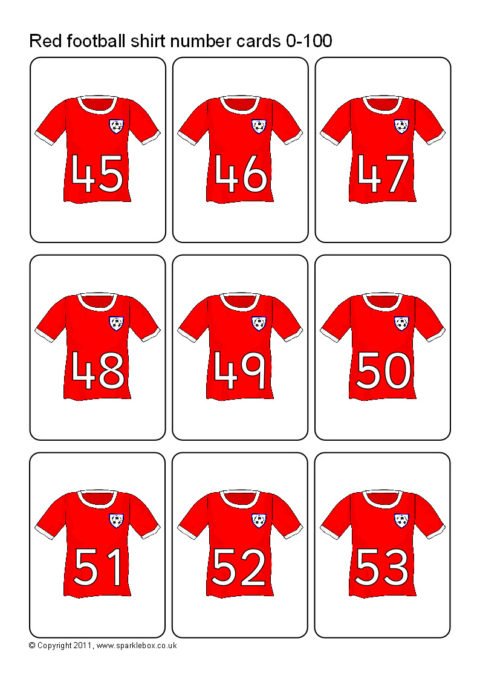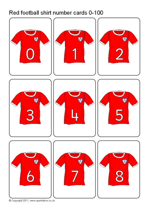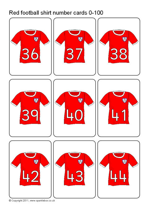 A set of number cards with numbers 0 to 100 on red football jerseys. 9 cards per A4 sheet.