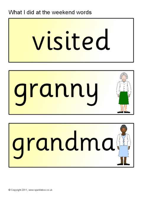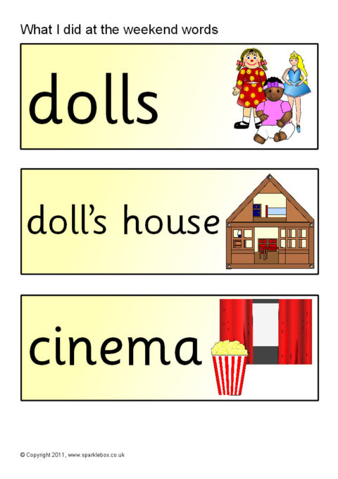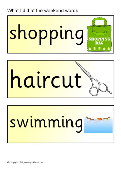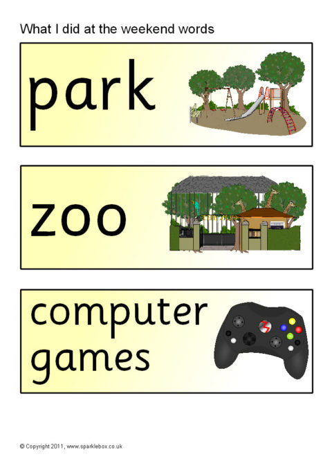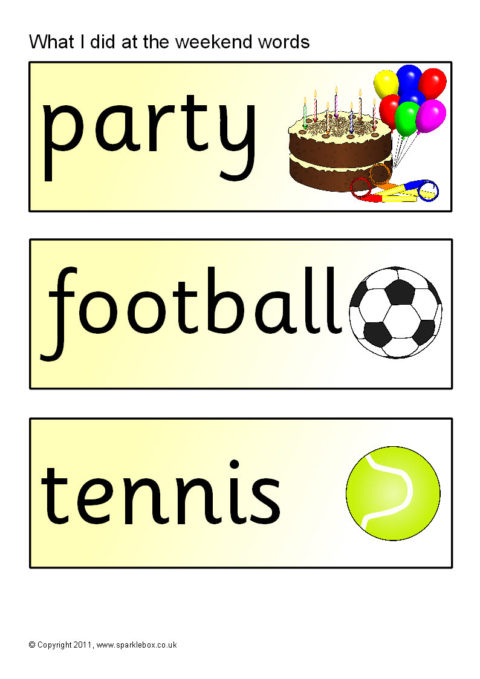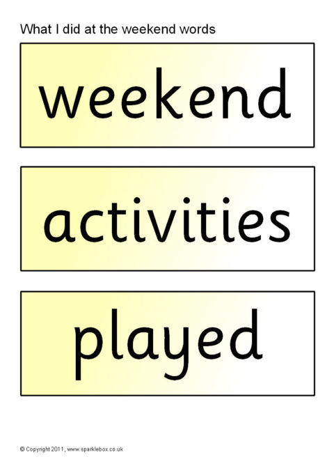 A set of printable word and picture cards for use in word banks or classroom displays to aid children’s writing about their weekend activities.