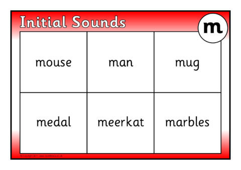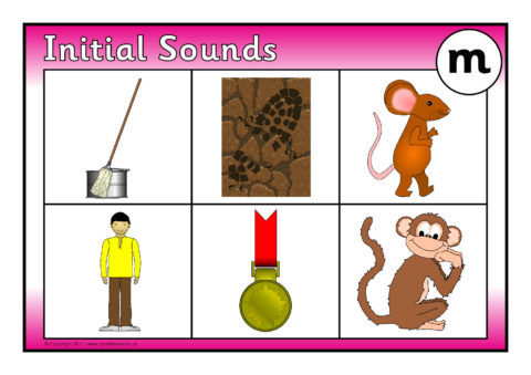 Printable bingo boards and picture cards where children match the pictures to the words featuring the initial sound ‘m’.