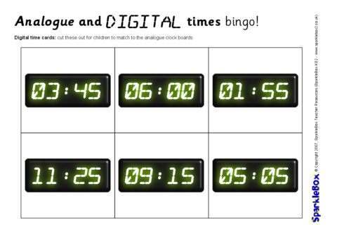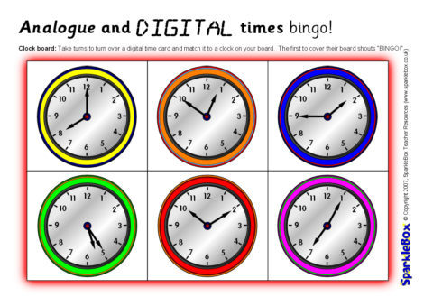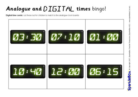 A set of printable bingo boards and cards for matching digital clock times to analogue clocks.