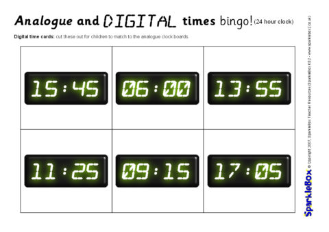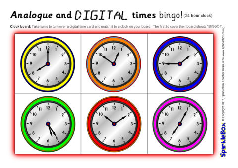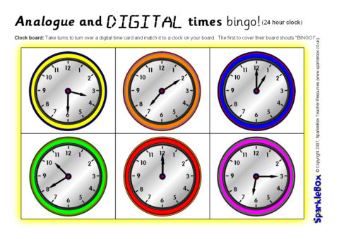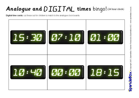 A set of printable bingo boards and cards for matching digital clock times (including 24-hour times) to analogue clocks.