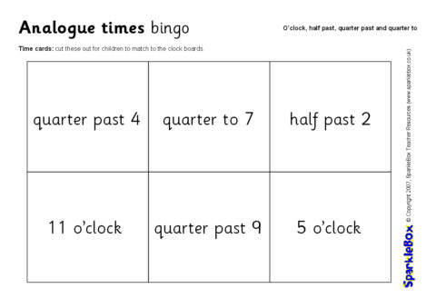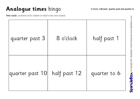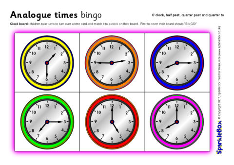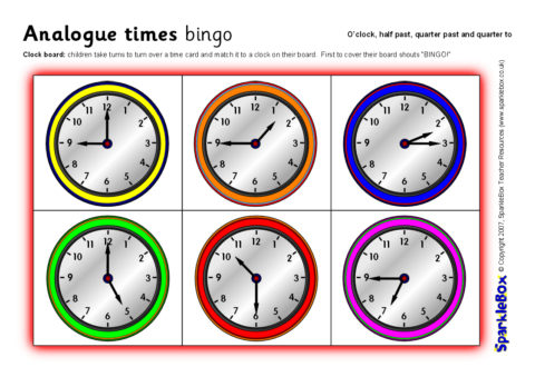 A printable bingo set which includes clock boards and written time boards. Laminate the boards for extra durability. A simple but fun activity where children match the analogue clock time to the times on their board and vice versa.