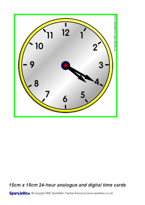 A set of printable cards with 24-hour analogue and digital times (at 5 minutes), each sized 15cm x 15cm.