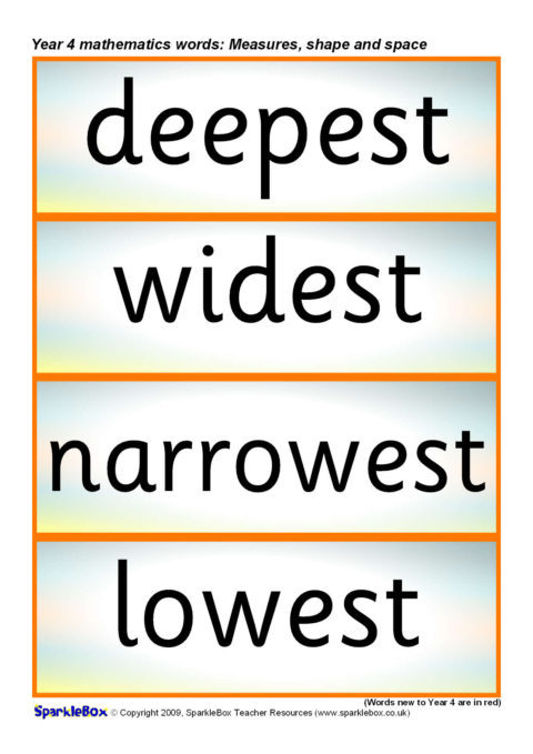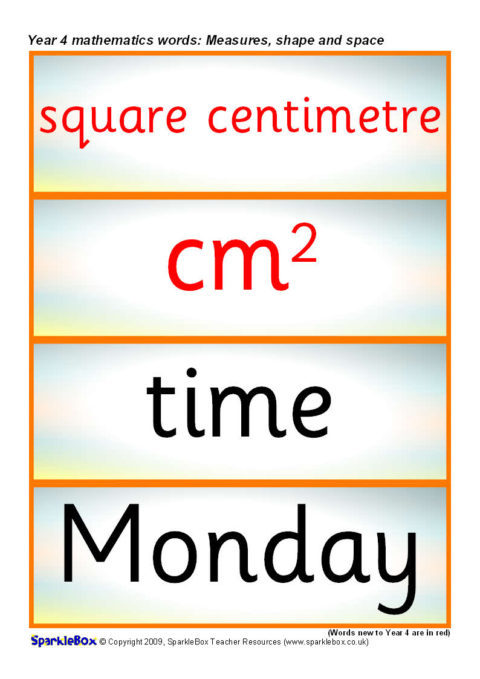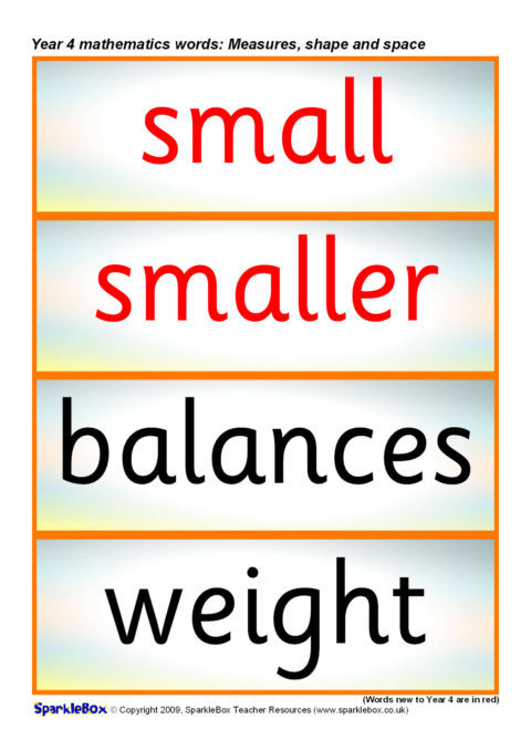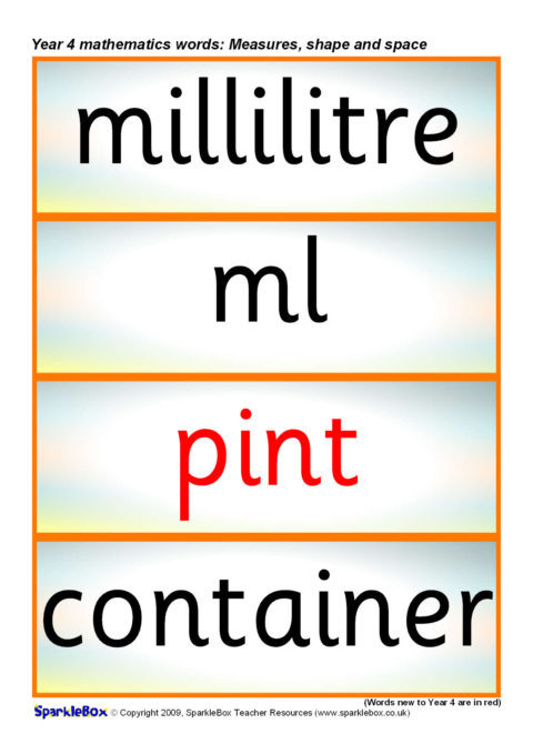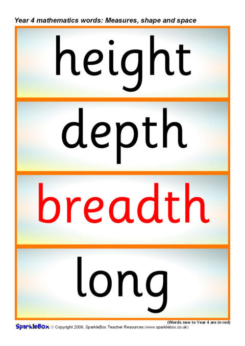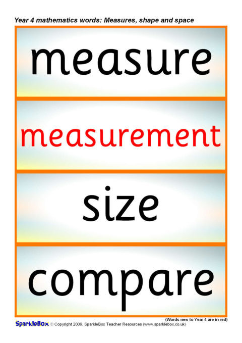 A set of printable cards featuring the mathematical vocabulary for ‘Measures, shape and space’ to be used in Year 4.