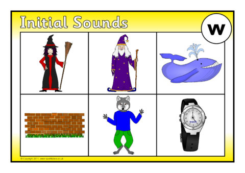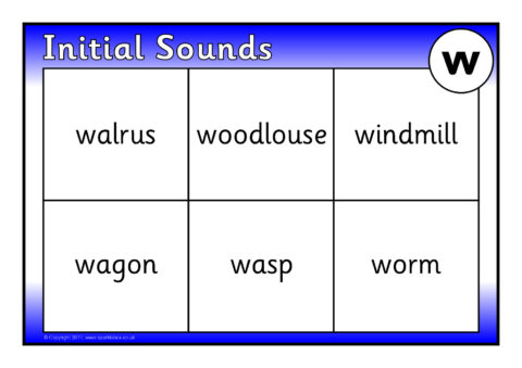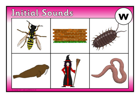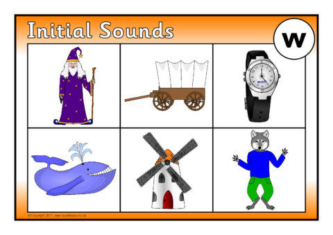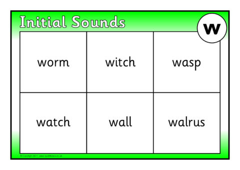 Printable bingo boards and picture cards where children match the pictures to the words featuring the initial sound ‘w’.