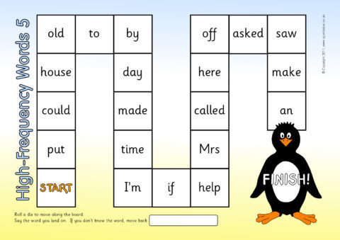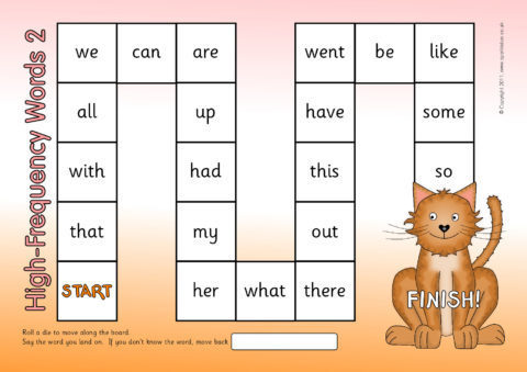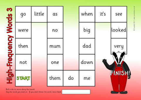 Simple printable board games where children roll a die to move across the board. Children say the word they land on. If they can’t, they move back.