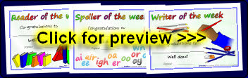 Three colourful certificates to award to your class reader, writer and speller of the week.