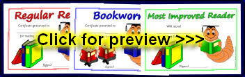 A group of general certificates for reading. Includes ‘Bookworm’, ‘Regular Reader’, ‘Reading Target Achieved’, ‘Super Reader’ and more.