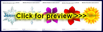A set of 12 colourful printable A4 sheets featuring the months of the year on various ‘natural’ pictures representing the season in which they come. Snowflakes for the winter months, flowers for spring, suns for summer months and leaves for Autumn. Ideal for classroom displays.