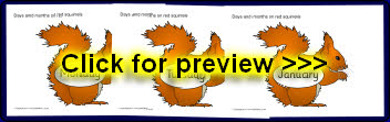 The days of the week and months of the year in cursive script presented on red squirrels.