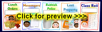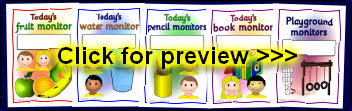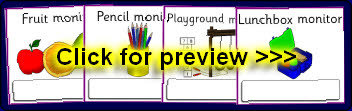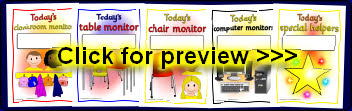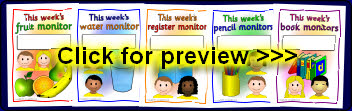 A selection of posters that can be used to show children's responsibilities. Includes, table monitor, water monitor, book monitor, register monitor.