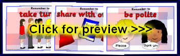 A set of useful A4-sized posters to promote good manners in your classroom. Each has a colourful picture and clear, bright text. Includes ‘Take turns’, ‘Be polite’, ‘Tidy up’, ‘Put things away’, ‘Put your hand up’ and more.