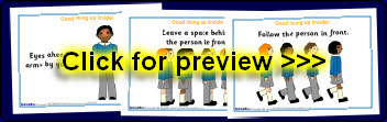 A set of posters to remind children to walk/queue with their hands on hips and fingers on lips.