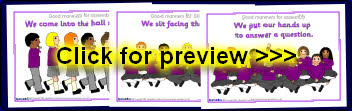A set of 5 A4-sized posters showing rules for good lining up and sitting for assembly.