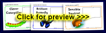 An additional set of 3 printable A4 sheets for you to write learning objectives on, featuring 3 characters: ‘Clever Caterpillar’, ‘Brilliant Butterfly’ and ‘Sensible Squirrel’.