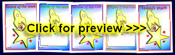 A colourful set of 11 A4 signs featuring a rocket and star. Print and laminate these signs to show which alphabet sounds, numbers, shapes and words you are learning about each week, together with daily snacks and special helpers.