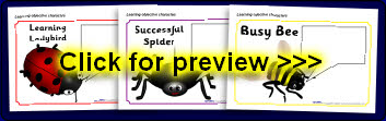 3 printable A4 sheets for you to write learning objectives on, featuring 3 characters: ‘Learning Ladybird’, ‘Successful Spider’ and ‘Busy Bee’.