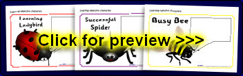 3 printable A4 sheets for you to write learning objectives on, featuring 3 characters: ‘Learning Ladybird’, ‘Successful Spider’ and ‘Busy Bee’.