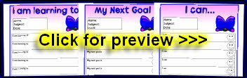 Editable target sheets (for Microsoft Word) with the text ‘I am learning to...’, ‘My next goal is...’ and ‘I can...’. Each sheet has space for 10 targets.