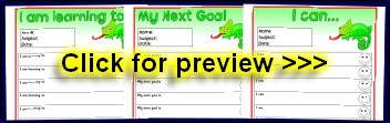 Editable target sheets (for Microsoft Word) with the text ‘I am learning to...’, ‘My next goal is...’ and ‘I can...’. Each sheet has space for 10 targets.