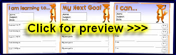 Editable target sheets (for Microsoft Word) with the text ‘I am learning to...’, ‘My next goal is...’ and ‘I can...’. Each sheet has space for 10 targets.