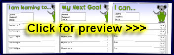 Editable target sheets (for Microsoft Word) with the text ‘I am learning to...’, ‘My next goal is...’ and ‘I can...’. Each sheet has space for 10 targets.