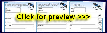 Editable target sheets (for Microsoft Word) with the text ‘I am learning to...’, ‘My next goal is...’ and ‘I can...’. Each sheet has space for 10 targets.