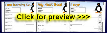 Editable target sheets (for Microsoft Word) with the text ‘I am learning to...’, ‘My next goal is...’ and ‘I can...’. Each sheet has space for 10 targets.