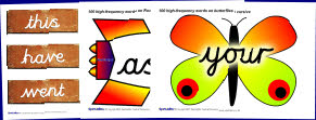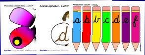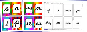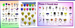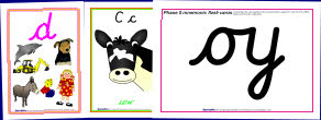 Printable A4 sheets showing the phonemes specified in the DfES ‘Letters and Sounds’ document in cursive script along with appropriate pictures for each sound.