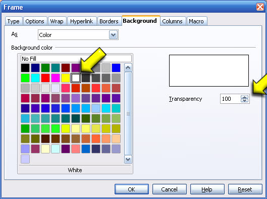 9. Now click the ‘Background’ tab and click the white colour and change the transparency to ‘100%’ by typing 100 in the box (see below):
