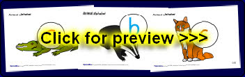 The 26 lowercase alphabet sounds presented on animal pictures. 1 per A4 page.