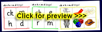 A set of printable bingo boards and cards using the phonemes ck, e, h, r, m, and d. The set consists of 4 different letter boards and 4 different picture boards as well as picture and letter cards. The game can be played by matching pictures to letters, or letter to pictures.