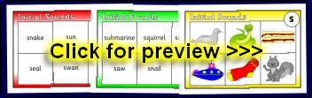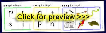 Printable bingo boards and picture cards where children match the pictures to the words featuring the initial sound ‘s’.