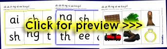 A set of printable bingo boards and cards using the phonemes ch, sh, th, ng, ai and ee. The set consists of 4 different phoneme boards and 4 different picture boards as well as picture letter cards. The game can be played by matching pictures to letters, or letters to pictures.