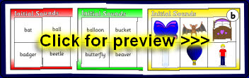 Printable bingo boards and picture cards where children match the pictures to the words featuring the initial sound ‘b’.