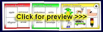 Printable bingo boards and picture cards where children match the pictures to the words featuring the initial sound ‘a’.