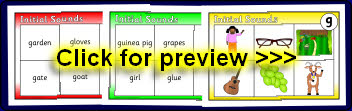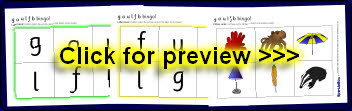 Printable bingo boards and picture cards where children match the pictures to the words featuring the initial sound ‘g’.
