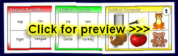 Printable bingo boards and picture cards where children match the pictures to the words featuring the initial sound ‘t’.