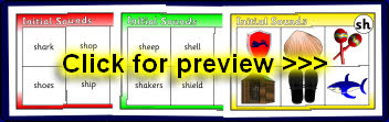 Printable bingo boards and picture cards where children match the pictures to the words featuring the initial digraph ‘sh’.