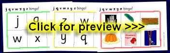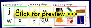 A set of printable bingo boards and cards using the phonemes j, q, v, w, x, y and z. The set consists of 4 different letter boards and 4 different picture boards as well as picture and letter cards. The game can be played by matching pictures to letters, or letter to pictures.