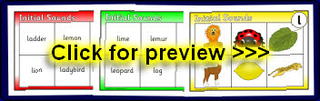 Printable bingo boards and picture cards where children match the pictures to the words featuring the initial sound ‘l’.