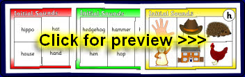 Printable bingo boards and picture cards where children match the pictures to the words featuring the initial sound ‘h’.